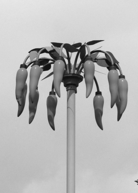 辣椒树?辣椒灯! “辣椒”做灯罩,你见过吗?走近溪龙乡后河村,一进村口,就可以看到一个高大的辣椒路灯。红红的“辣椒”变成了一个个造型各异的灯罩,显得特别醒目。 夏鹏飞 摄