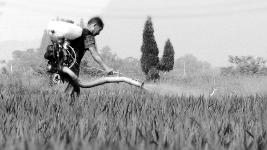 昨天,在溪龙乡徐村湾村江师傅正在田头喷洒除虫剂。据了解,现在正是卷叶虫等病虫害的高发期,县农业局提醒广大的农户要及时做好预防和应对措施。 夏鹏飞 摄