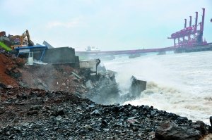 防波堤垮塌现场(8月8日摄)。目前海水暂时被控制住。新华社记者 闫平 摄
