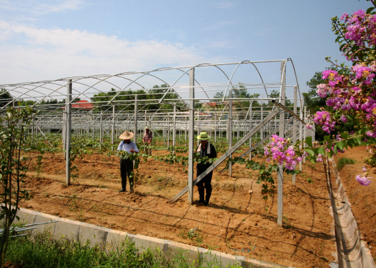 在安吉山水灵峰农业精品园内,昨天技术人员正在种植葡萄。据介绍,除70亩葡萄外,园内还将种植桃子等果树,吸引游客开展采摘游等活动。夏鹏飞 摄
