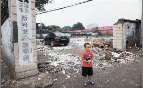 海淀东升乡,一男孩站在已被拆除的打工子弟学校——新希望小学门口。图片来源:新京报 浦峰 摄