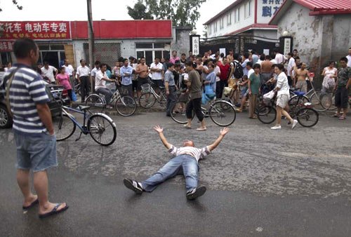 日前,因租房合同到期,新希望小学办校用地被东升乡科技管理站收回,一名家长躺在地上,嘴里喊着“我们也为北京作了贡献”。图片来源:新京报 浦峰 摄