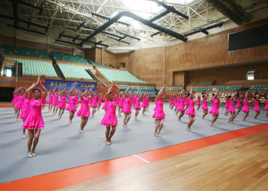 在县龙山体育馆内,来自全市五个县区的五支排舞代表队近日上午参加了湖州市第七届运动会(大众体育部)排舞比赛。比赛分团体排舞规定曲目和团体排舞自选曲目。 夏鹏飞 摄