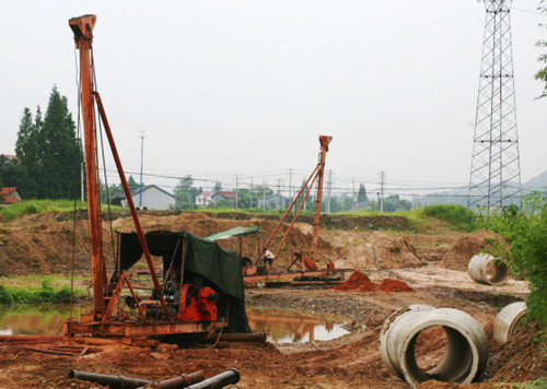 在城西北区块内的狮子山桥施工现场,施工人员昨天正抓紧时间打桩基。该桥梁目前已经打了26根桩,完成了总桩基的50%左右,争取在10月中旬桩基工程完工。梁板也已浇筑了40块,力争在10月底前开始架设。夏鹏飞 摄