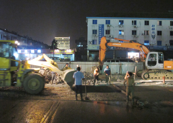 在县城浦源大道改造现场, 昨天晚上施工人员、大型机械设备正在灯火下奋战。据了解,一方面夜间车流量比较少,不会影响到施工,另一方面,也可以加快施工的进度。 夏鹏飞 摄