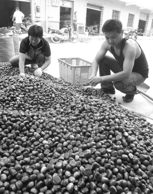 记者在杭垓镇缫舍村看到,家家户户都忙着剥板栗,那油亮亮的板栗还真诱人。据了解,今年板栗收购价格比去年高,现在是销售旺季,每天有二、三十吨板栗运往外地市场。 於袁民 摄