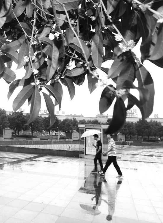 进入秋季,到处可以闻到桂花香。在生态广场,记者看到,由于一场雨,使得桂花飘落一地,但若有若无的淡淡清香还是让人心旷神怡。 於袁明