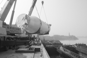 上午八点钟,记者赶到现场的时候,四艘运力达1200吨的货船早就停泊在码头岸边。由于设备太重,安吉本地的起重机根本吊不起。上午八点二十分,杭州锅炉运输公司两辆大型起重机到达川达码头。经过一番准备,上午九点四十分起吊,两辆起重机将一台设备吊起,二十多分钟后,设备准确无误地安置在船上。